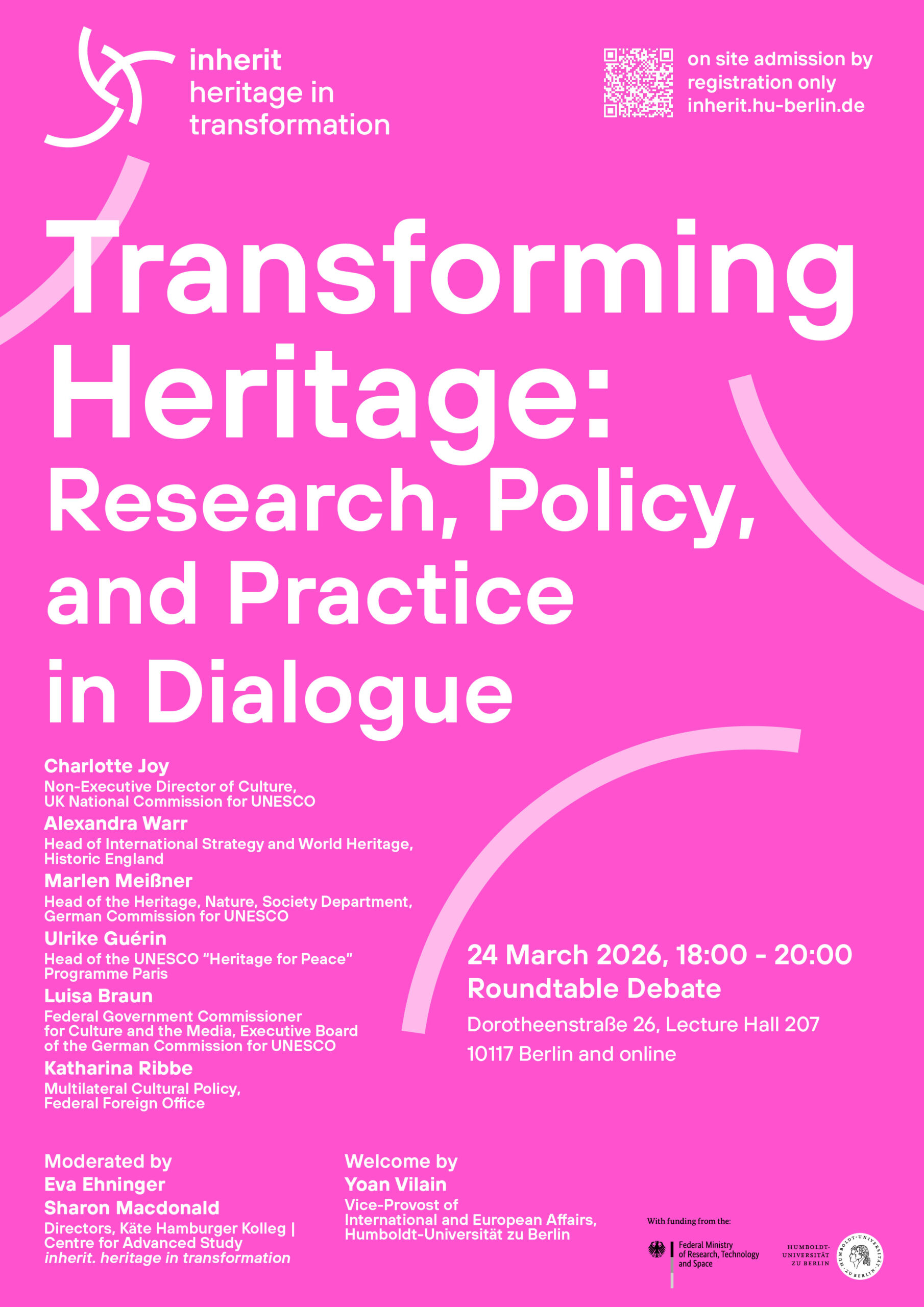 The roundtable is organized by inherit. heritage in transformation, a BMFTR-funded Centre for Advanced Study at Humboldt-Universität zu Berlin, which deals with historical, present and future transformations in the field of heritage.